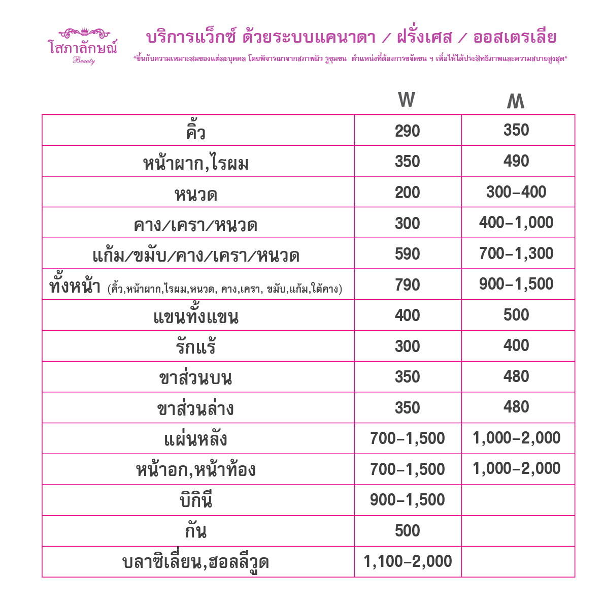 โสภาลักษณ์บิวตี้ เรามีบริการแว็กซ์ส่วนต่างๆ ตามความต้องการและความสะดวกเฉพาะบุคคล เช่น บริเวณแขน ขา รักแร้ คิ้ว หนวด ใบหน้า บิกินี่ และบลาซิเลี่ยน ฯลฯ โดยผู้เชี่ยวชาญการแว็กซ์โดยเฉพาะ