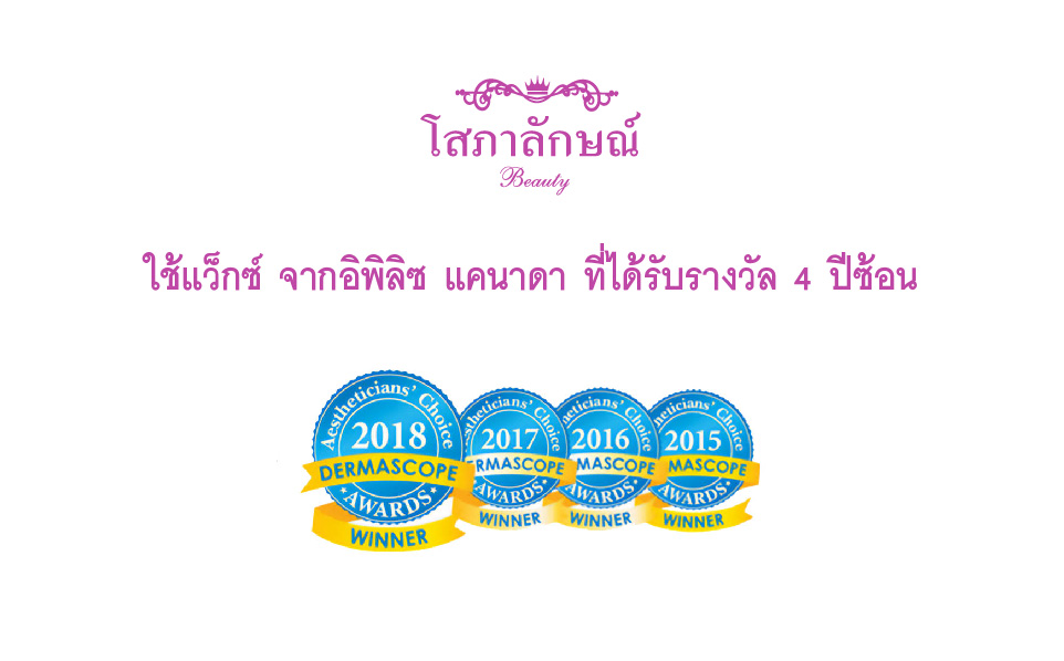 โสภาลักษณ์บิวตี้ แว็กซ์กำจัดขนด้วยมืออาชีพ ใช้ “ระบบแว็กซ์เพื่อการกำจัดขนเต็มรูปแบบที่มีคุณภาพสูงสุด นำเข้าจากแคนาดา " หมายถึงการให้ความสำคัญทั้งก่อน ระหว่าง และหลังการแว็กซ์อย่างพิถีพิถัน กันรันตีความยอดเยี่ยมด้วยรางวัลระดับชาติ 2 ปีซ้อน ผลลัพธ์จึงได้ ผิวที่เรียบ เนียน สวย ขาว ไม่เจ็บและไม่แดง